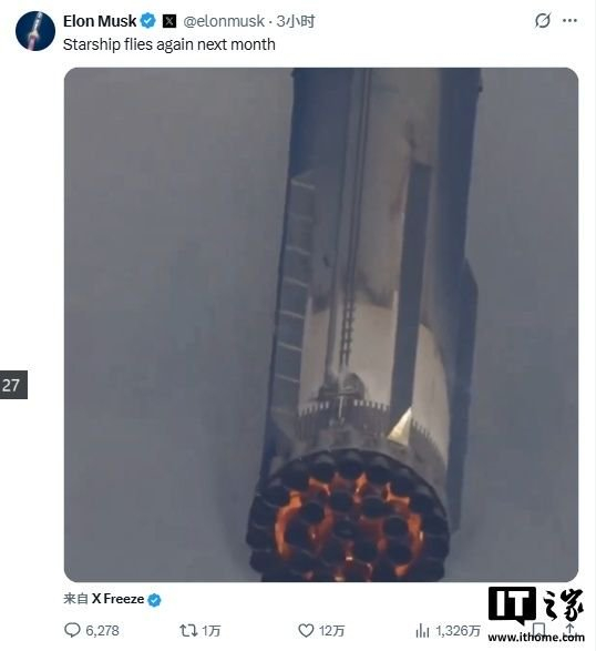 IT之家 2 月 22 日消息,艦下SpaceX 首席執(zhí)行官埃隆 · 馬斯克今天在 X 平臺(tái)發(fā)消息稱(chēng),再次星艦(Starship)火箭將于下個(gè)月再次試飛。試飛飞飞28预测专业加拿大